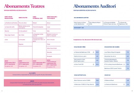 - Cicle Música de Cambra: 36 € (preu general 55 €): Luna Poleno (Miguel Hortigüela), Empremtes (Dos de Lis), L’Octet de Mendelssohn (Quartets Teixidor i Altimira), El Trio Ludwig interpreta Beethoven, Beethoven 2020 (Quartet Teixidor).