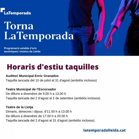 Horari d'estiu de la taquilla https://teatreescorxador.paeria.cat/ca/noticies/183 https://teatreescorxador.paeria.cat/@@site-logo/brand.png
